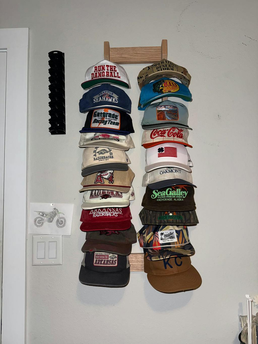 - You can fold hats to hang them like in picture three or can hang them by the strap.